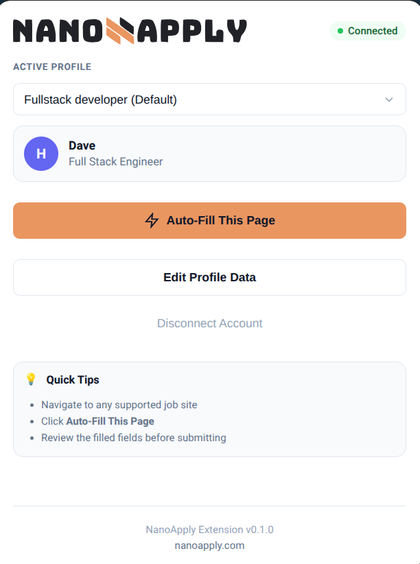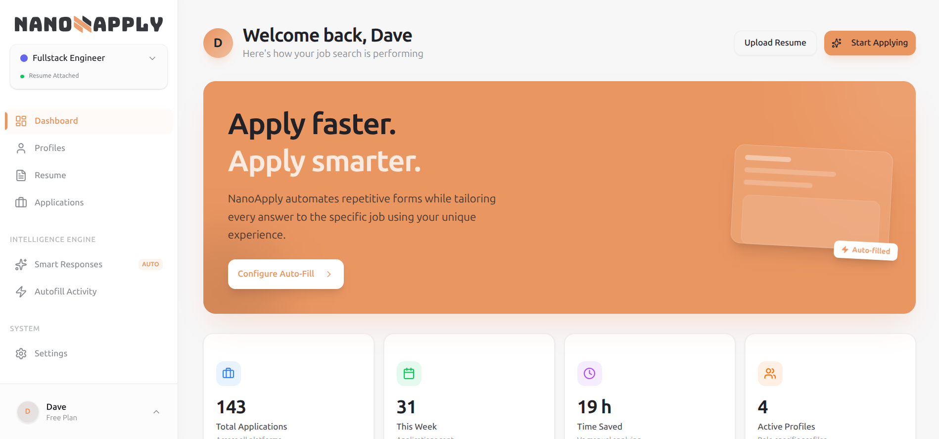 NanoApply combines a web dashboard, a Chrome extension, and generative intelligence to remove friction from job hunting. Focus on the interview, not the form.